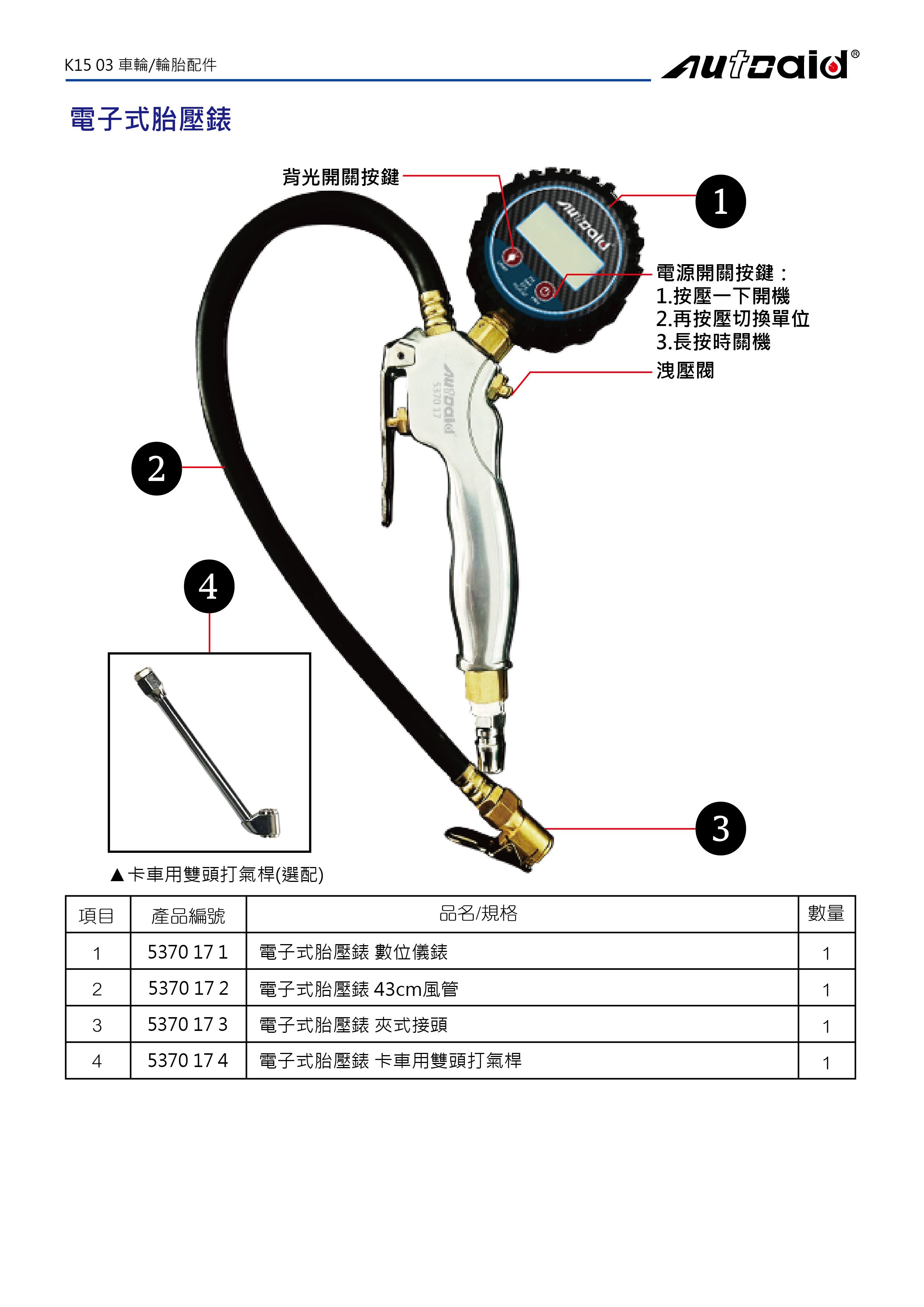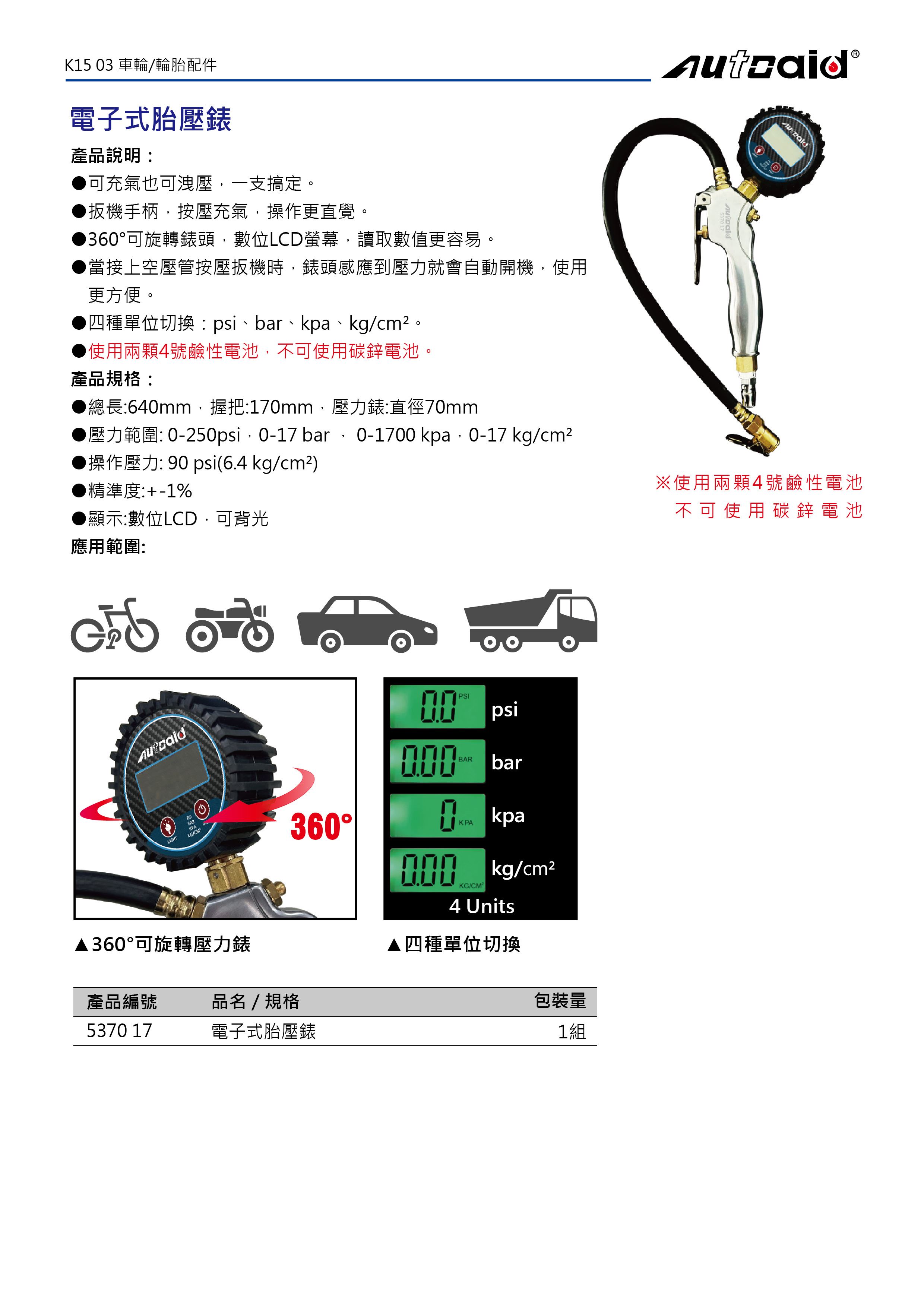 ●四種單位切換:psi、bar、kpa、kg/cm²。
